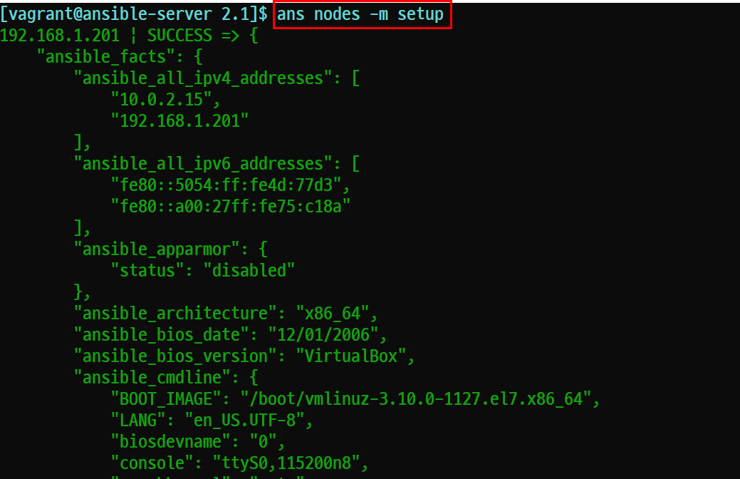 # ansible <인자 값을 확인하고자 하는 노드> -m setup