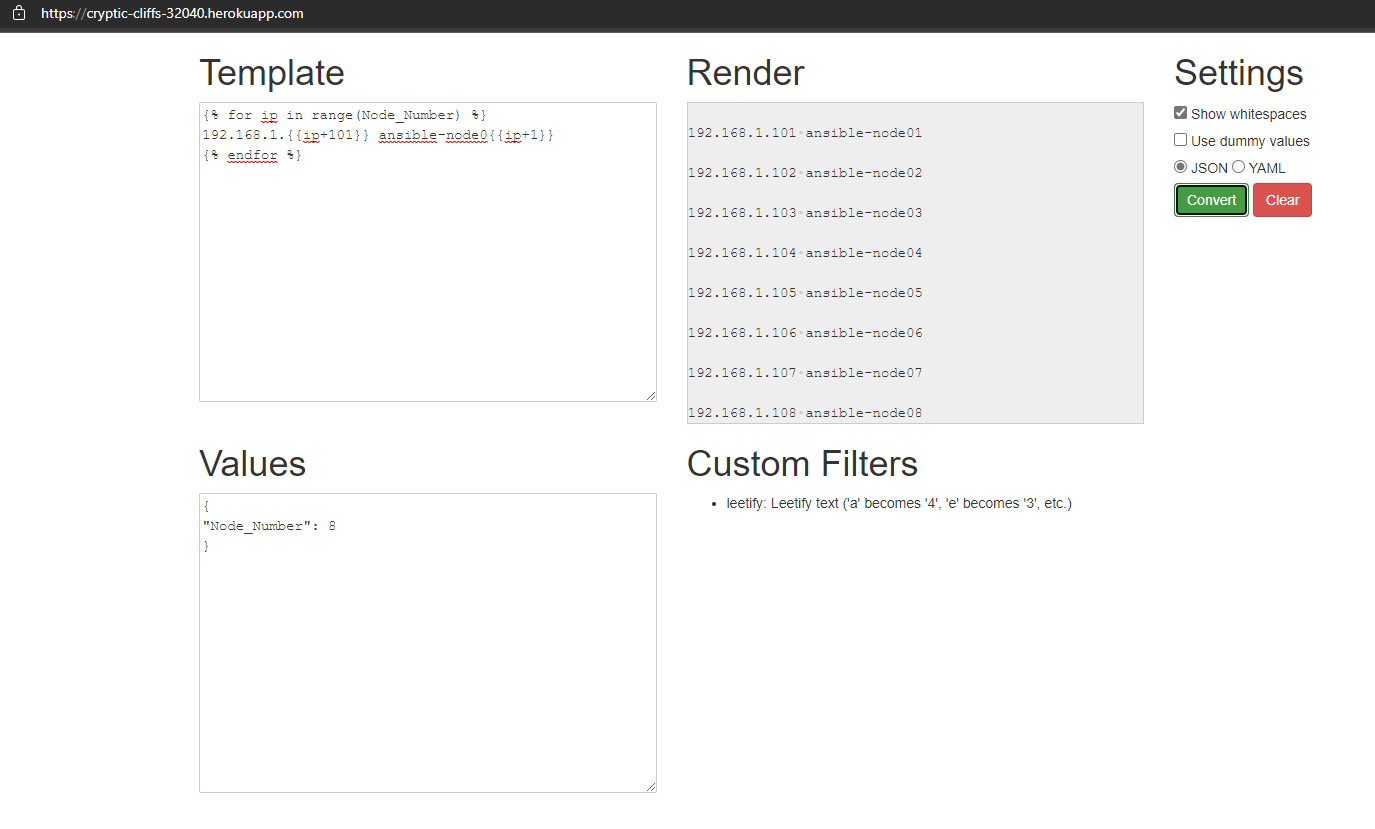 Values { "name": "John", "test": true } Custom Filters leetify: Leetify text ('a' becomes '4', 'e' becomes '3', etc.)