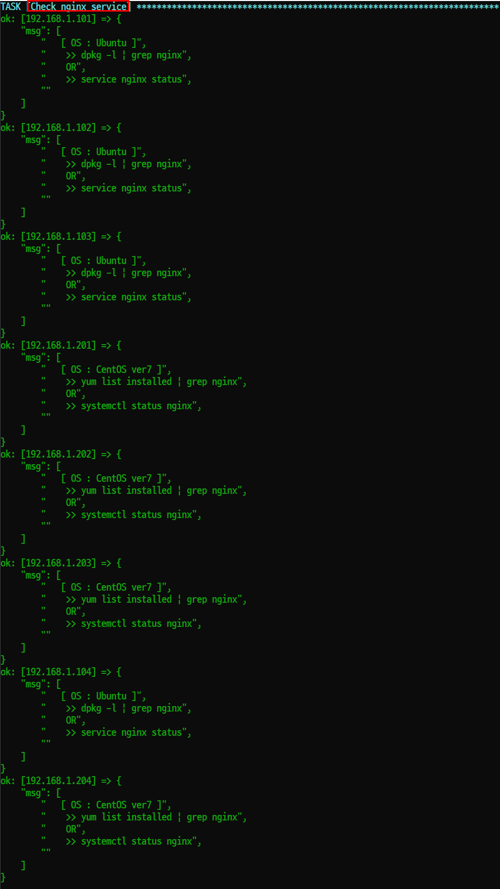 split을 사용하여 개행 문자별로 구분해주고 해당 메시지를 debug 모듈을 사용하여 출력해준다. 이때 화면에 출력되는 내용이 ins_chk.j2에 작성된 코드이다.