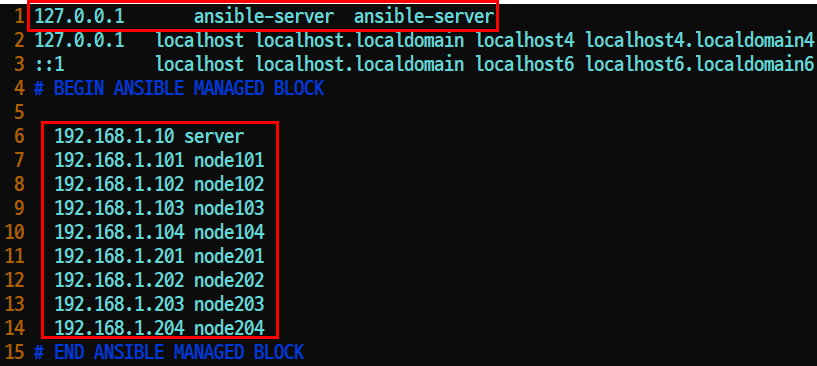 즉, for문을 사용하면 모든 node와 ansible-server의 /etc/hosts에 아래와 같이 작성되는 것이다.