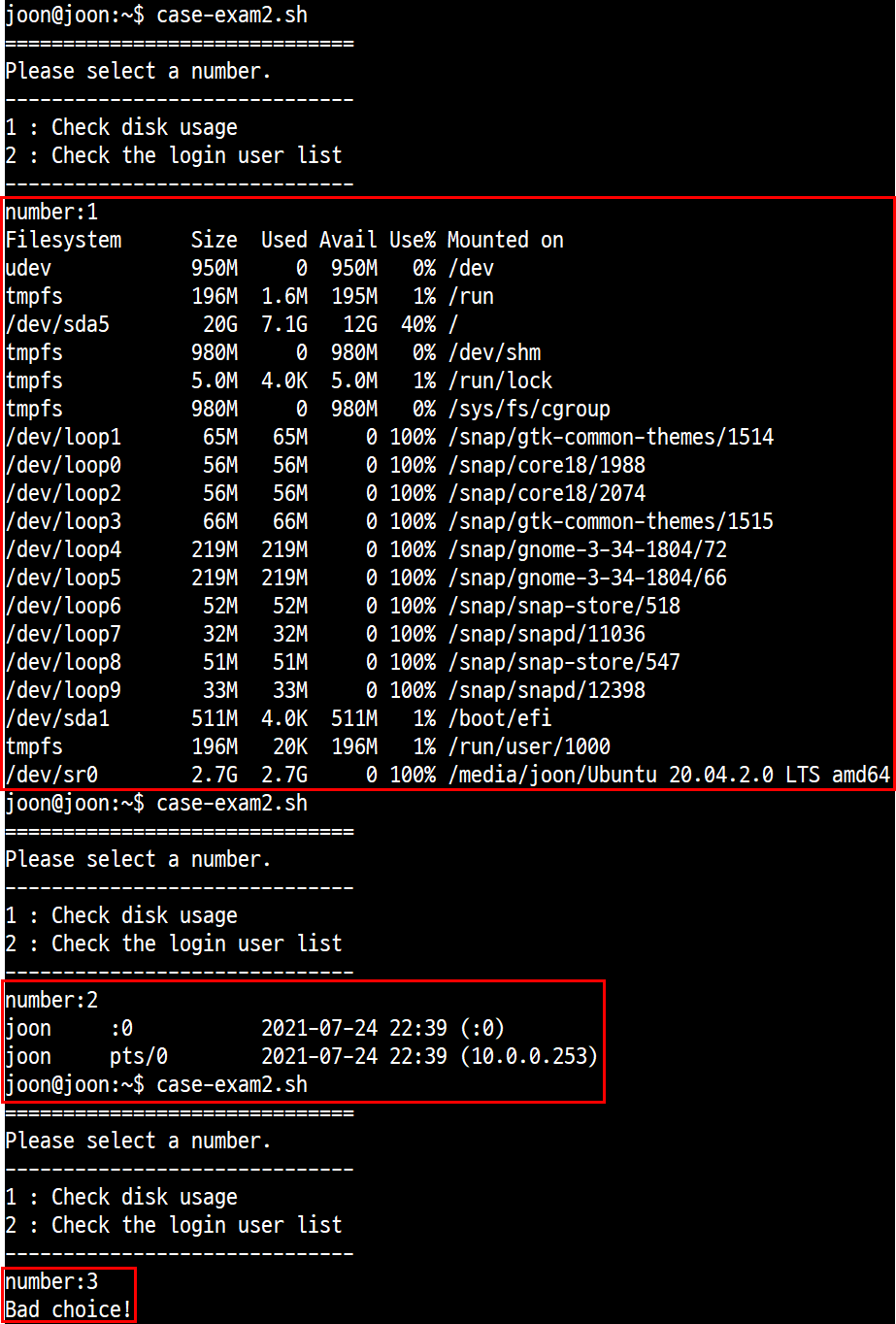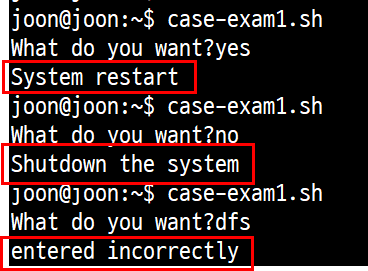case-exam1.sh를 실행하고 yes, no, 아무 값을 3번 넣어본 결과이다.