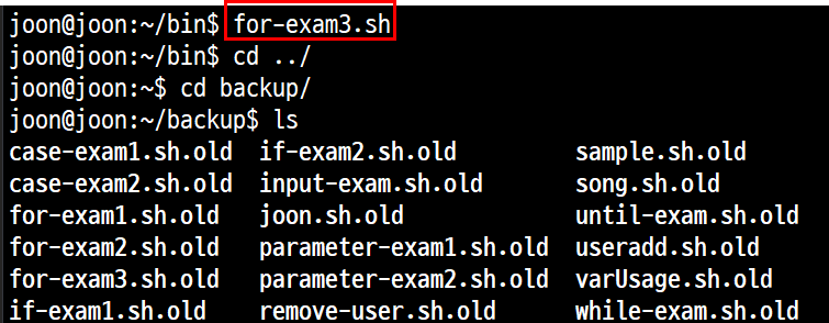 # chmod u+x for-exam3.sh