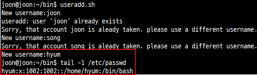 1. 계정 생성 셸 프로그램 : username을 입력 받고 해당 계정이 있을 때는 "계정이 존재한다" 표시하고 계정이 new user인 경우 생성해준다.