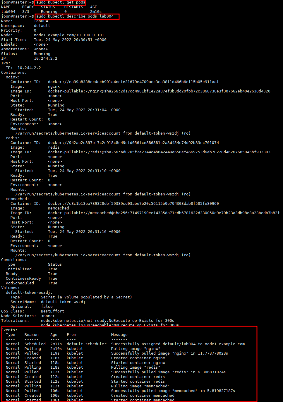 - Create a pod name lab004 with 3 containers running, nginx, redis, memcached