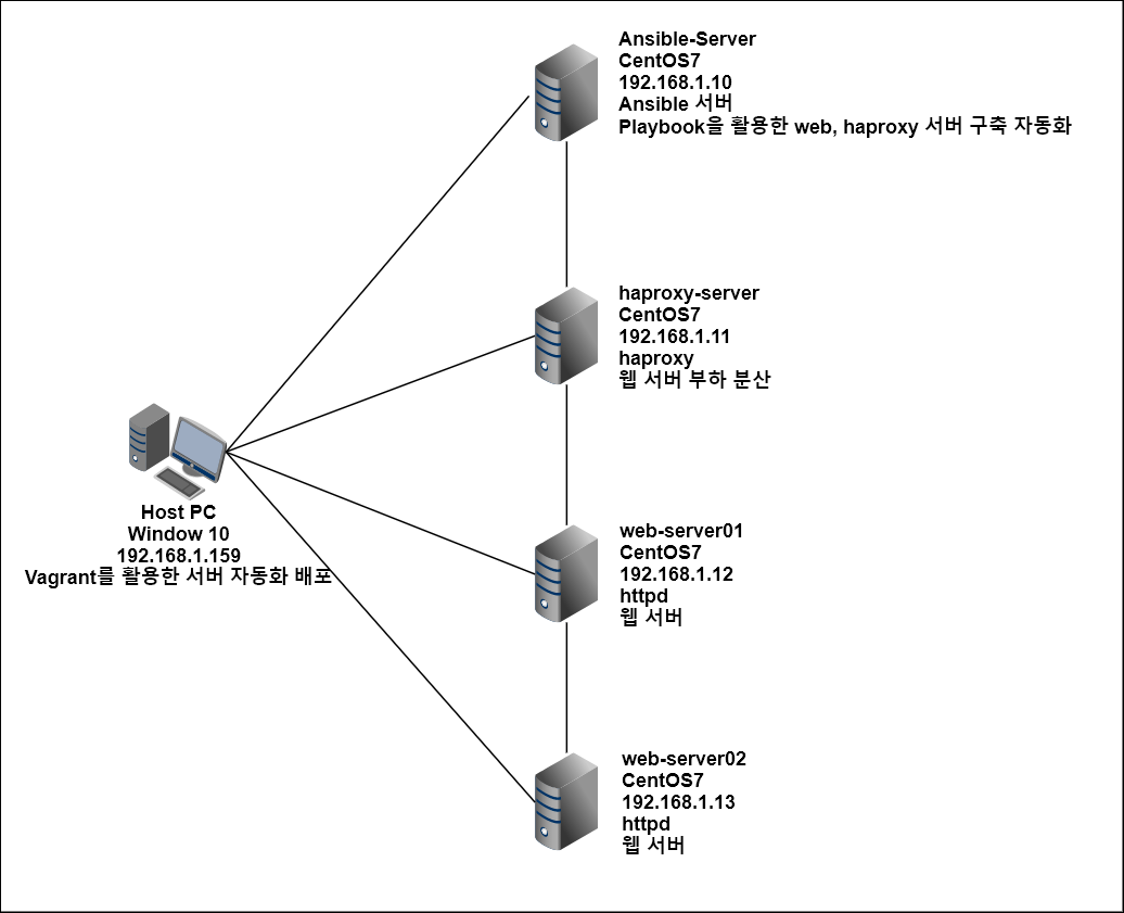 1. 구성도 및 계획 1. Host PC에서 Vagrantfile을 작성하여 Ansible-Server 및 총 4대의 서버 프로비저닝 2. Host PC에서 httpd template을 작성하고 Ansible-Server를 프로비저닝하면서 해당 탬플릿을 실행하여 httpd 웹 서버를 자동으로 구성 3. Host PC에서 haproxy.yml을 작성하고 Ansible-Server를 프로비저닝하면서 해당 플레이북을 동작시켜 자동으로 haproxy 로드벨런서 구성 4. 192.168.1.11로 접속시 정상적으로 웹서버에 접근이 가능하며 web-server01과 web-server02에 Round-Robin 메커니즘으로 번갈아가면서 한 번씩 접속된다. 2. Vagrantfile 작성 # Vagrantfile V..